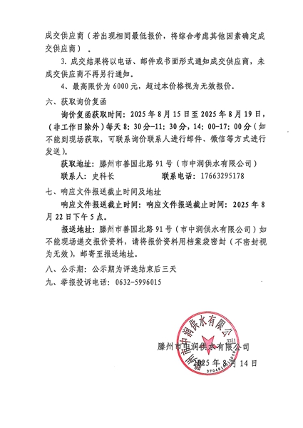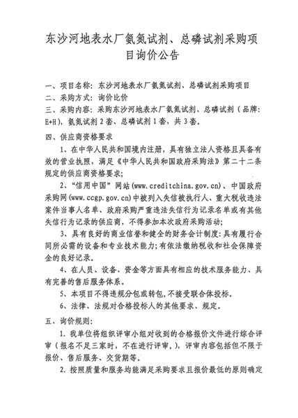 東沙河地表水廠氨氮試劑、總磷試劑采購項目詢價公告