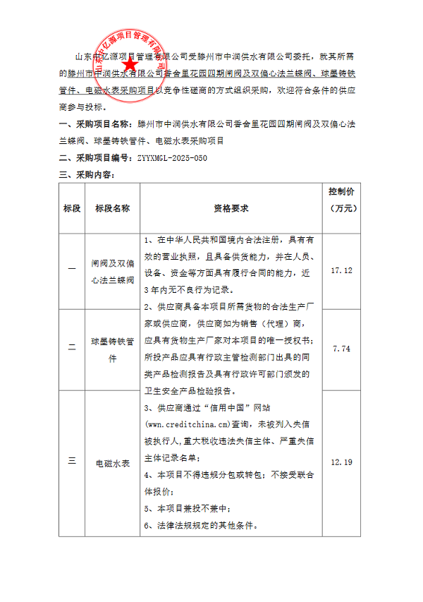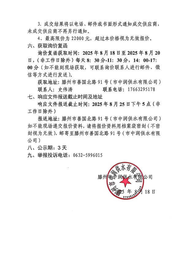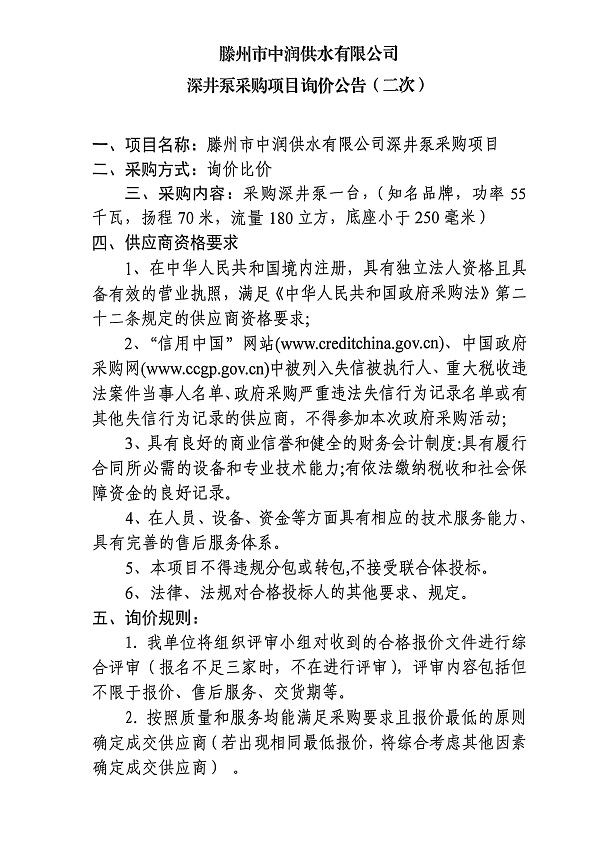 滕州市中潤供水有限公司深井泵采購項目詢價公告(二次)