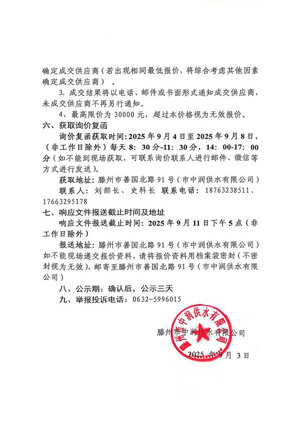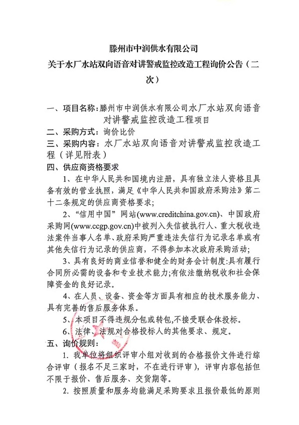 滕州市中潤供水有限公司關于水廠水站雙向語音對講警戒監控改造工程詢價公告(二次)