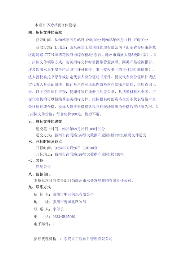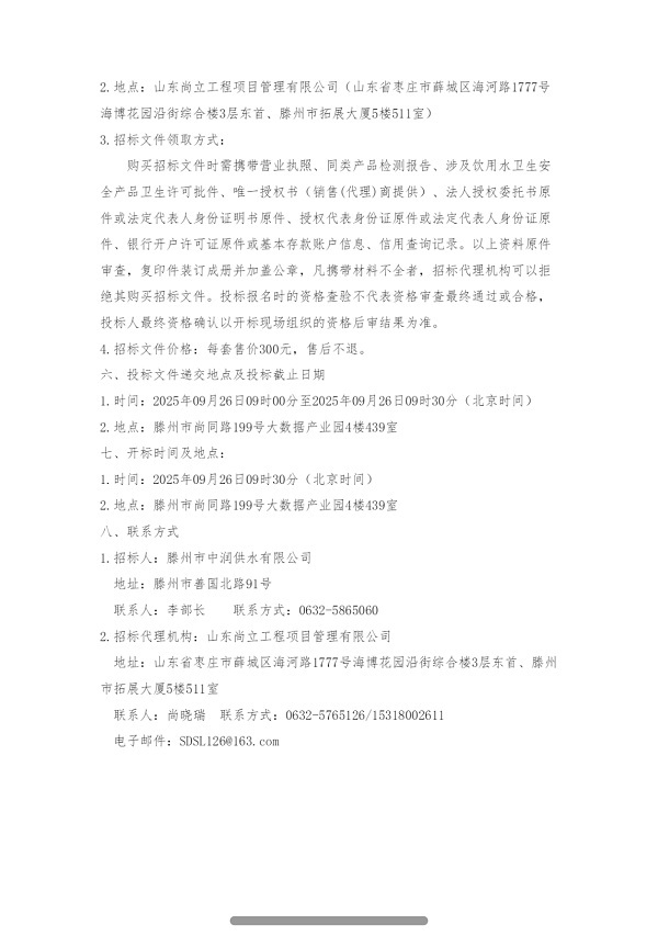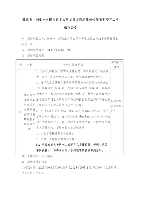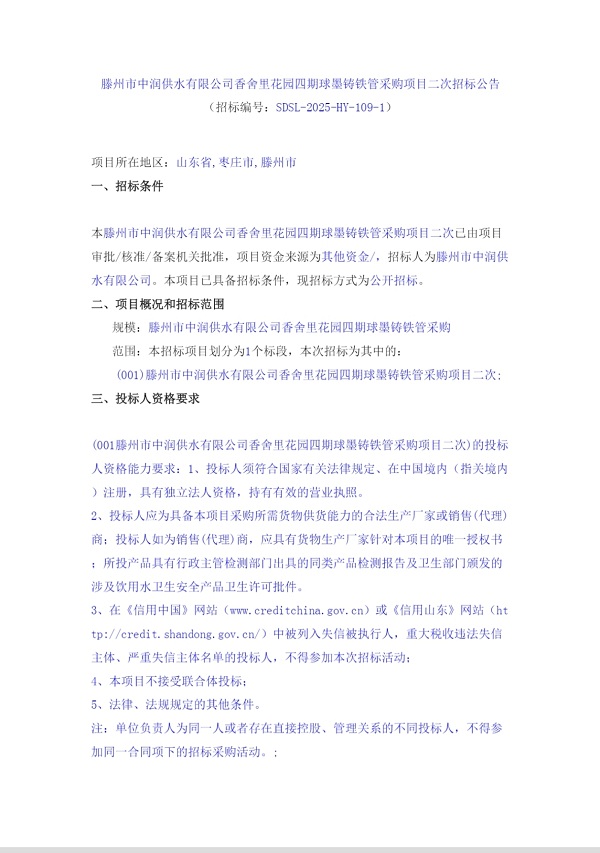 滕州市中潤供水有限公司香舍里花園四期球墨鑄鐵管采購項目二次招標公告