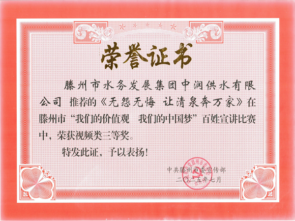 為深入學(xué)習(xí)貫徹習(xí)近平新時代中國特色社會主義思想,推動黨的創(chuàng)新理論“飛入尋常百姓家”,7月17日,滕州市“我們的價值觀 我們的中國夢”百姓宣講比賽在市融媒體舉行。滕州市水務(wù)發(fā)展集團(tuán)中潤供水有限公司推薦的《無怨無悔 讓清泉奔萬家》作品,榮獲視頻類三等獎。